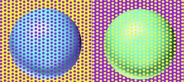 Las bolas parecen diferentes porque la de la izquierda está rodeada de puntos morados sobre un fondo amarillo y la de la derecha está rodeada de puntos amarillos sobre un fondo morado.
